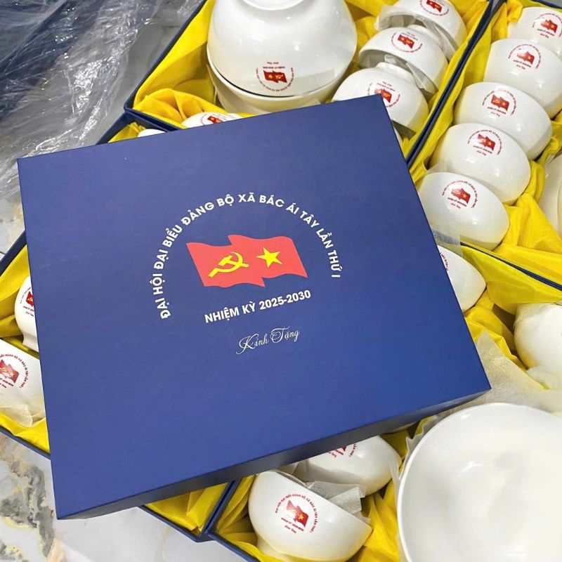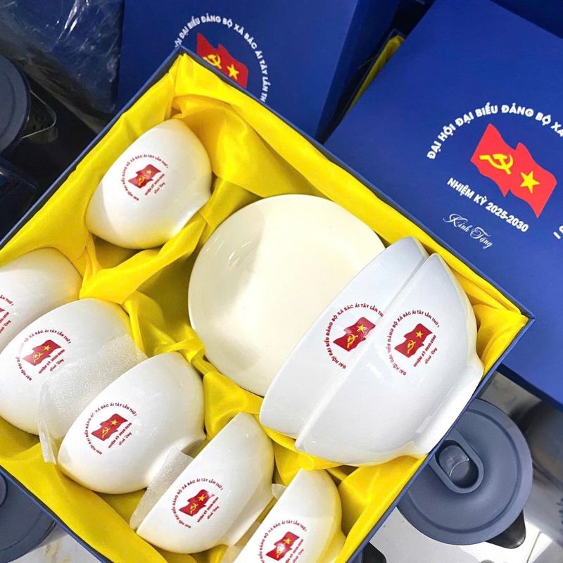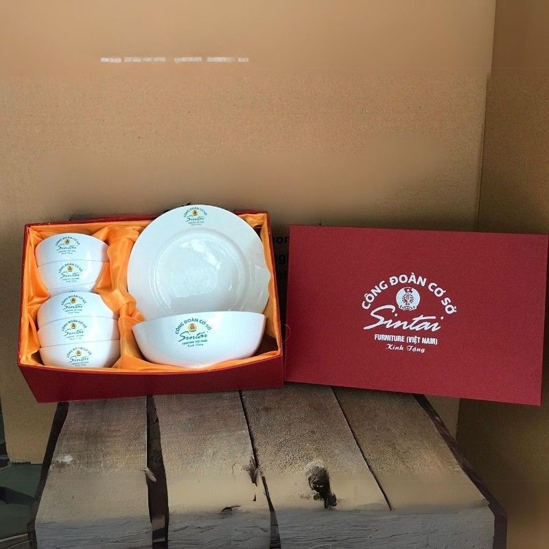 - Hộp Quà Sang Trọng, Nâng Cao Giá Trị: Bộ bát đĩa được đặt trong hộp quà tặng cao cấp, có thể in ấn thông tin doanh nghiệp lên hộp, làm tăng tính thẩm mỹ và giá trị của món quà.