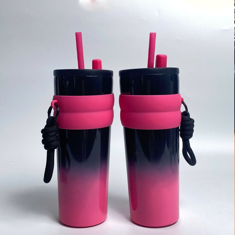 Cốc Giữ Nhiệt Candy In Logo Theo Yêu Cầu | CGNPPR11 – Màu Gradient Đen Hồng Độc Đáo, Có Ống Hút và Quai Xách Tiện Lợi