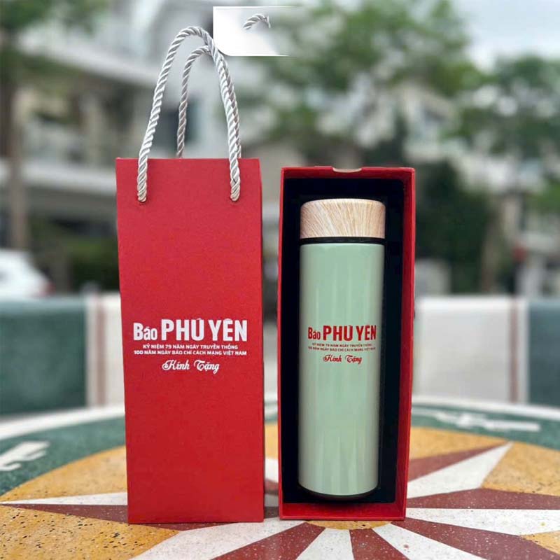Chi tiết nắp giả vân gỗ là điểm nhấn độc đáo, giúp chiếc bình trở nên nổi bật và cao cấp hơn. Thiết kế này đặc biệt phù hợp với các thương hiệu về Kiến trúc, Nội thất, Bất động sản, hoặc những doanh nghiệp hướng tới phong cách tối giản, thân thiện với thiên nhiên. Nó biến món quà trở thành một vật phẩm mang tính trang trí cao trên bàn làm việc.