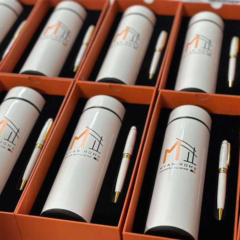 Cả bình giữ nhiệt và bút ký đều là vật phẩm được sử dụng thường xuyên trong môi trường làm việc. Bình giữ nhiệt đặt trên bàn làm việc, còn bút ký được sử dụng trong các cuộc họp và ký kết quan trọng. Việc logo được in khắc logo tinh xảo trên cả hai vật phẩm đảm bảo hình ảnh thương hiệu của bạn được hiển thị liên tục, từ đó gia tăng tần suất tiếp xúc thương hiệu (Brand Exposure). Đây là hình thức quảng cáo bền vững, hiệu quả hơn hẳn các chiến dịch marketing ngắn hạn.