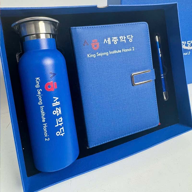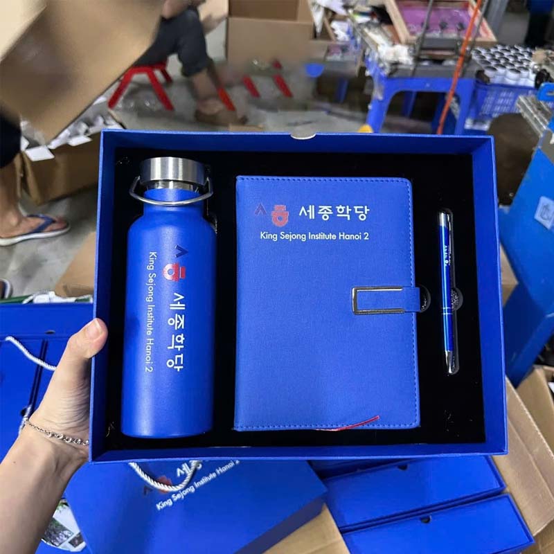 | Thành phần | 01 Sổ bìa da, 01 Bình giữ nhiệt 500ml có quai, 01 Bút ký. |