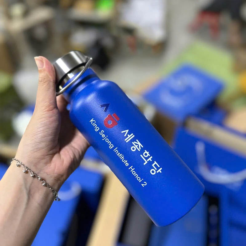 - Bình Giữ Nhiệt 500ml Có Quai Xách In Logo: Bình giữ nhiệt dung tích 500ml, làm từ Inox 304 chuẩn an toàn thực phẩm. Bình có khả năng giữ nóng/lạnh hiệu quả. Thiết kế có quai xách tiện lợi trên nắp giúp người dùng dễ dàng mang theo khi di chuyển, tập luyện. Logo công ty được in logo hoặc khắc laser lên thân bình, đảm bảo nhận diện thương hiệu luôn hiện diện.