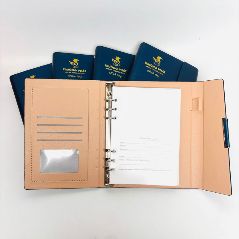 3. Sổ còng bìa da PU cao cấp: Sổ còng là lựa chọn linh hoạt và tiện dụng, với bìa được làm từ da PU (Polyurethane) mềm mại, cao cấp. Sổ còng cho phép người dùng dễ dàng thêm/bớt hoặc sắp xếp lại các trang giấy, tối ưu hóa quá trình ghi chép và quản lý dự án. Bìa da PU được dập chìm hoặc ép nhũ logo, tạo nên dấu ấn cá nhân hóa mạnh mẽ.