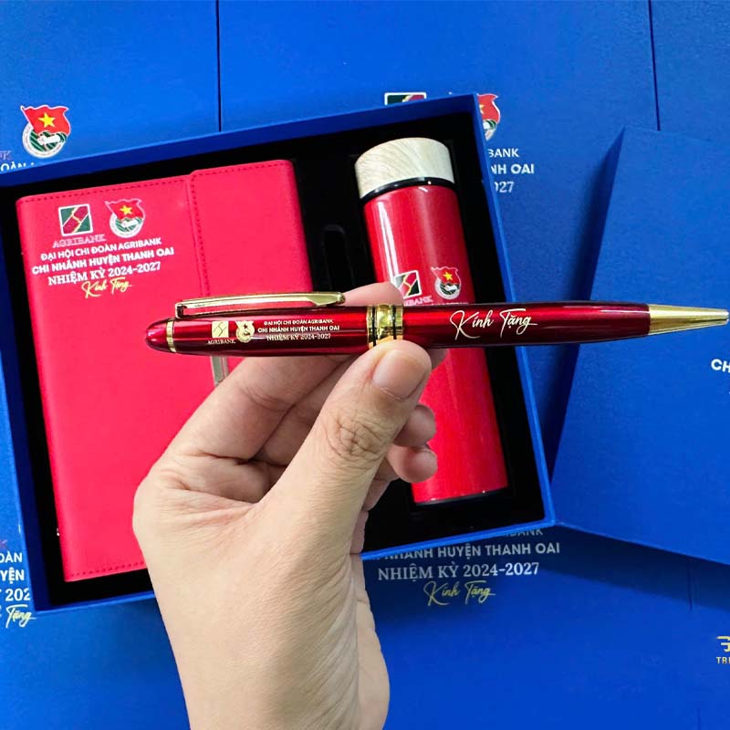- Bút ký khắc logo: Chiếc bút ký đi kèm là vật phẩm không thể thiếu, được lựa chọn với chất liệu kim loại hoặc hợp kim cao cấp. Logo doanh nghiệp được khắc logo bằng công nghệ laser, đảm bảo dấu ấn thương hiệu bền vững và sắc nét.