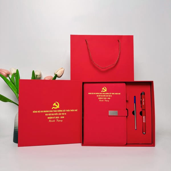 Điểm khác biệt của set quà tặng này là khả năng in logo doanh nghiệp đồng bộ trên tất cả các thành phần: Sổ, Bút, Hộp và Túi. Sự đồng bộ này tạo ra trải nghiệm quà tặng nhất quán, chuyên nghiệp và khẳng định sự đầu tư nghiêm túc của doanh nghiệp vào hình ảnh thương hiệu.