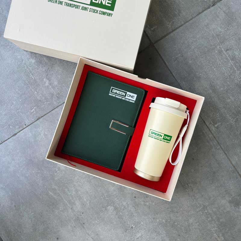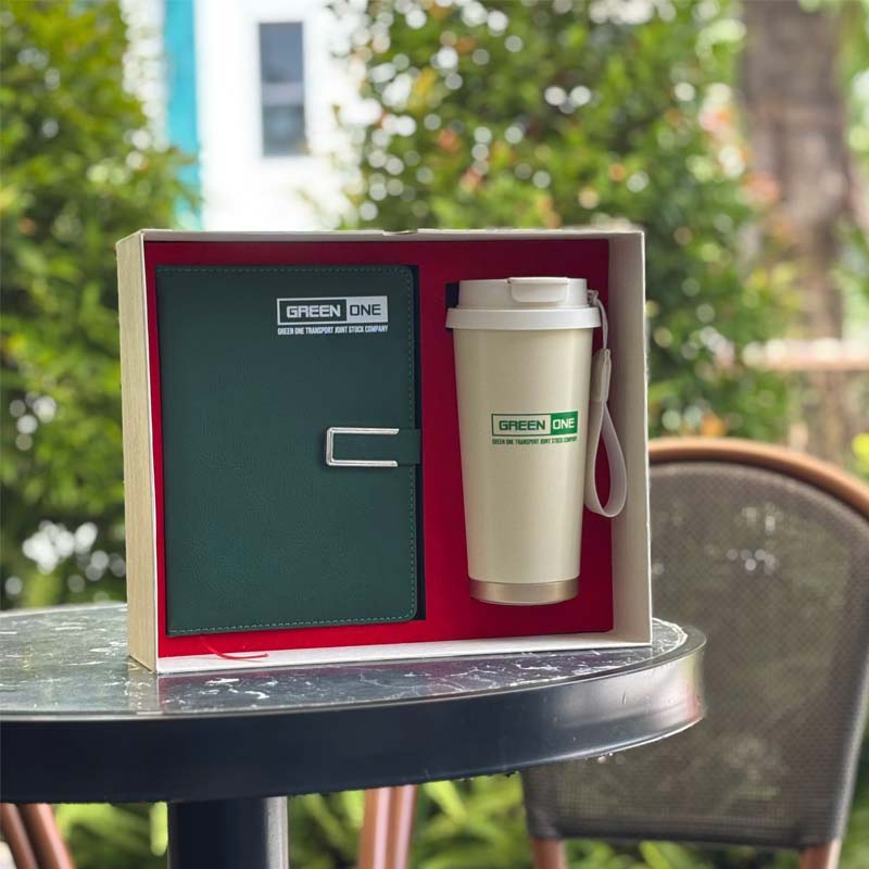 Chiếc cốc giữ nhiệt 530ml có quai xách dễ dàng trở thành phụ kiện cá nhân được mang theo hàng ngày, từ phòng họp, bàn làm việc đến phòng tập. Tương tự, sổ bìa da PU là vật dụng không thể thiếu. Việc logo được in logo lên cả hai vật phẩm này đảm bảo thương hiệu của bạn liên tục xuất hiện trong các không gian khác nhau, biến mỗi người nhận thành một kênh quảng bá di động hiệu quả cho chiến lược set quà tặng nhận diện thương hiệu.